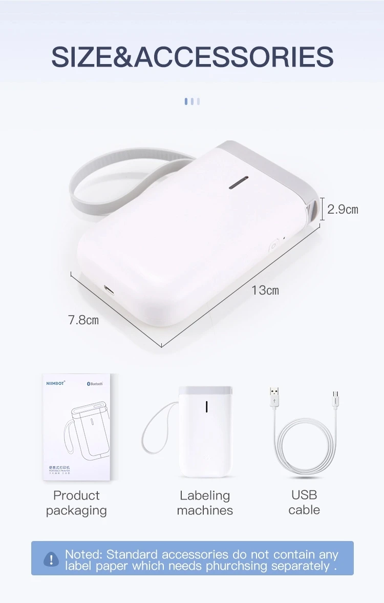 Материал: АБС + ПК Режим печати: термолинейная печать Ширина бумаги: 15 мм Ширина печати: 12 мм Скорость печати: 30-60 мм/секция. Срок службы печатающей головки: 50 км Подключение: BT 4,0 Беспроводное расстояние: 10 метров Разрешение: 203 точек/дюйм Напряжение: 5 В, 1 А Аккумулятор: встроенный литиевый аккумулятор 1200 мАч Время зарядки: 3-4 часа Размер изделия: 13,2*7,9*2,9 см/5,2*3,1 * дюйма Вес изделия: 186 г/6,6 унции Посылка: 18,5*11,5*4 см/7,3*4,5 * дюйма Вес посылка: 348 г/12,3 унции