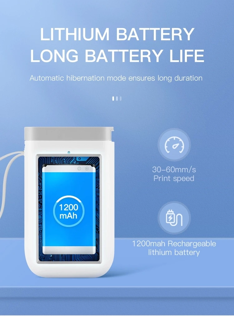1. Беспроводной дизайн Bluetooth, поддерживает печать на больших расстояниях. 2. Прямой термический, без чернил, тонера или лент. 3. Поддерживает все основные форматы этикеток: цену, дату, размер, вес, имя и т. Д. 4. Универсальный, простой в использовании. 5 миниатюрных и легких, удобных для переноски. 6. Аккумулятор емкостью 1200 мАч поддерживает длительное использование.