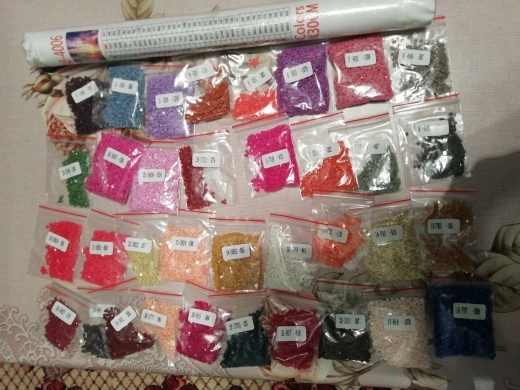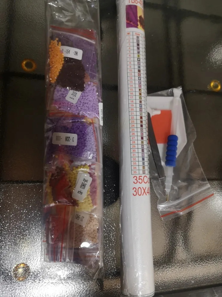 Доставка около 1 месяца до пункта выдачи. Пропечатка холста хорошая, реальный размер выкладки 29х39см. Стразы яркие, упакованы в зип-пакеты, все 35 цветов в наличии. В наборе следующие иструменты - лоток с носиком, простой хлипкий пинцет, стилус с насадками, масса для стилуса.