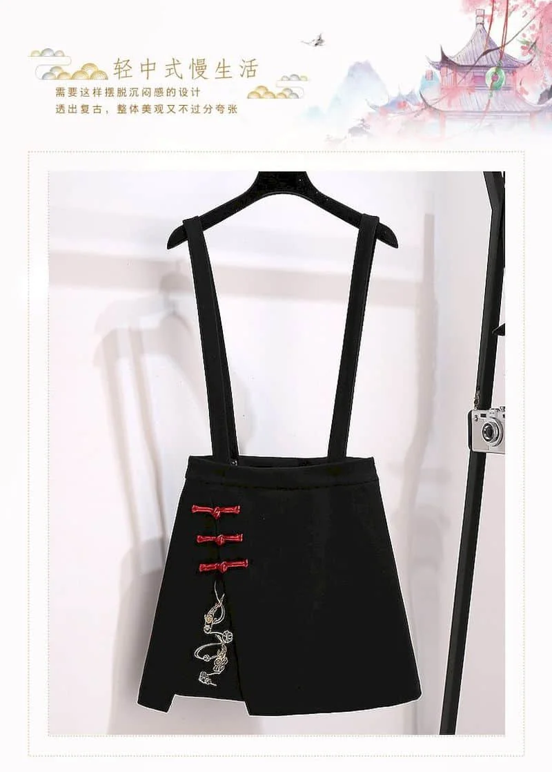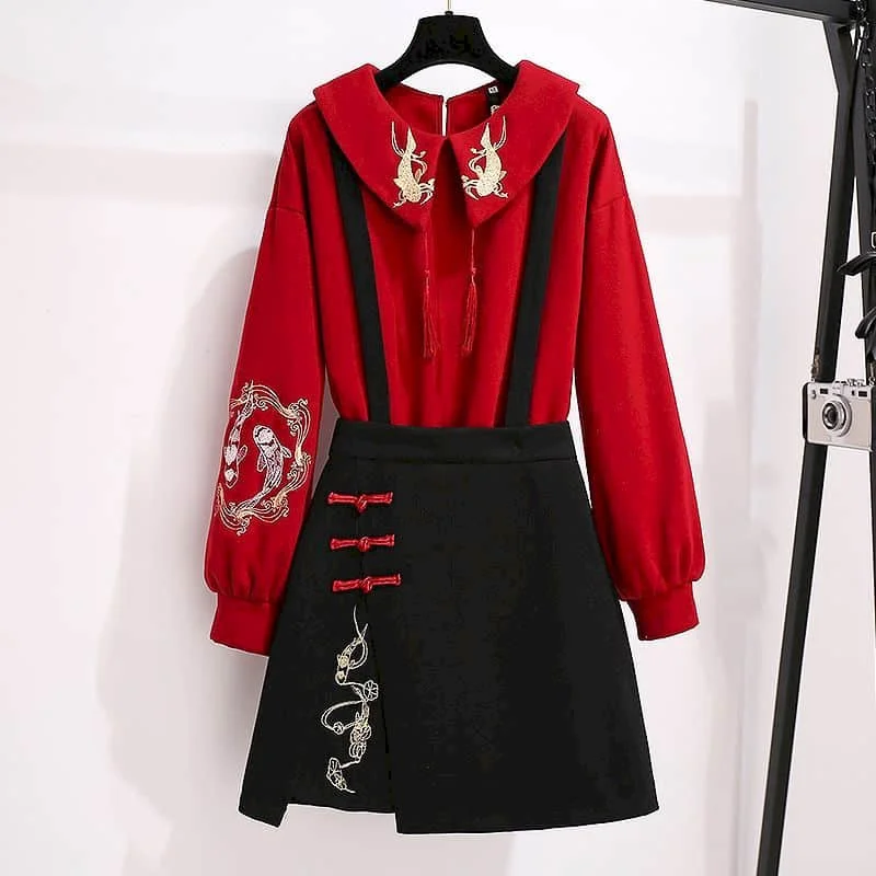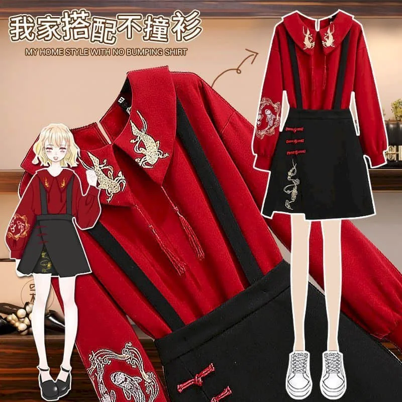 Женский костюм-двойка с юбкой и ремешком, праздничный красный костюм в китайском стиле ретро с вышивкой, в стиле Харадзюку, весна-осень, размера плюс