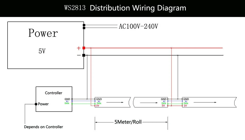 3.WS2813 должен использовать блок питания DC5V и светодиодный контроллер для управления!