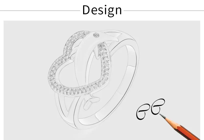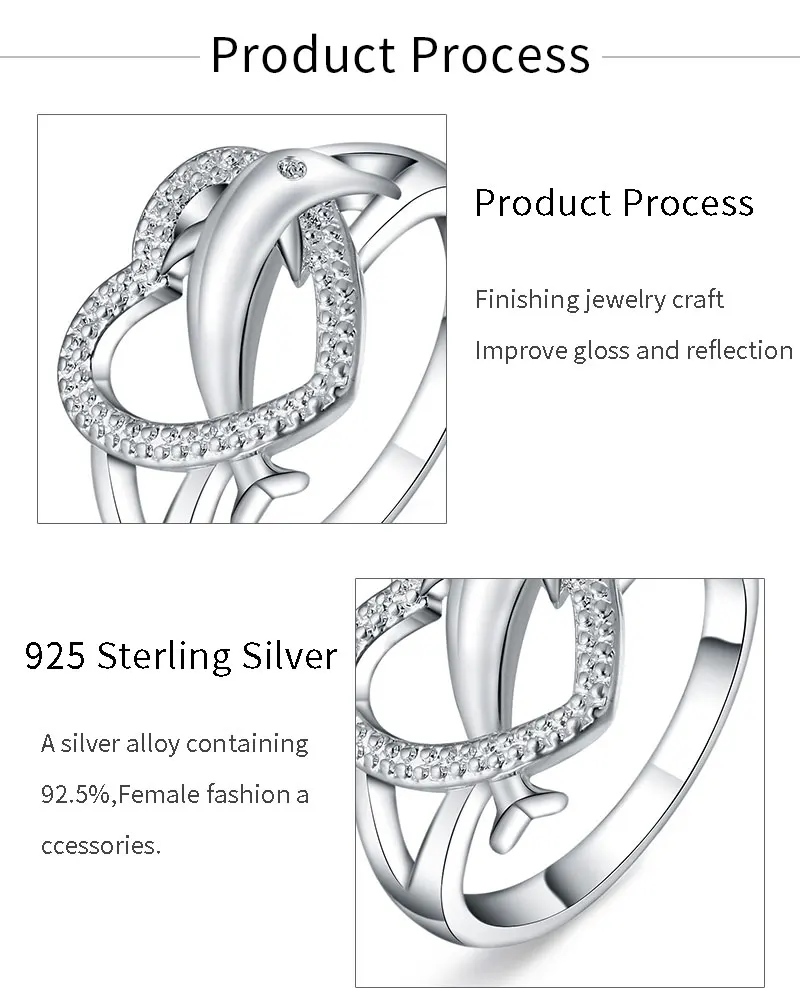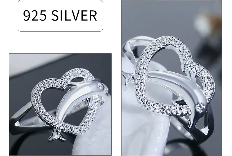 Женское кольцо из серебра 925 пробы, с дельфином, сердцем и кристаллом