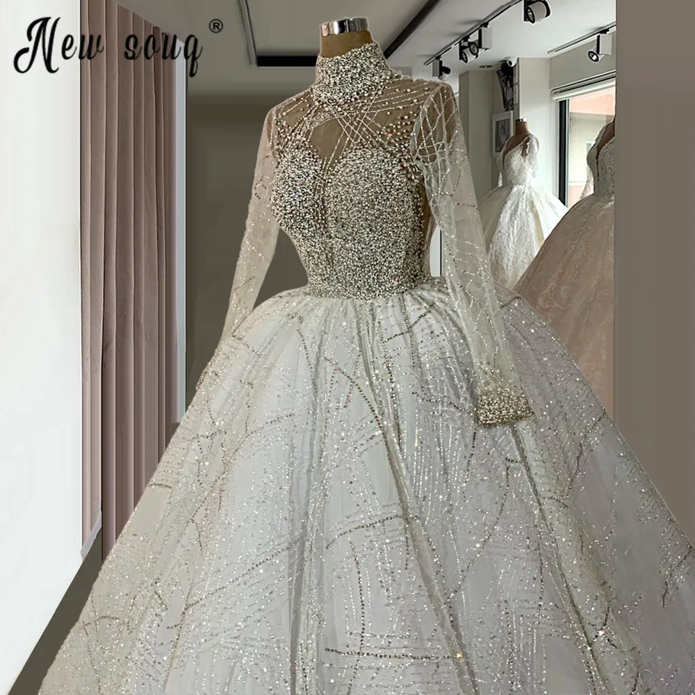 Роскошные свадебные платья с бисером, трапециевидные Свадебные платья с блестящими кристаллами, платья принцессы для невесты, мусульманское платье с высоким воротом и длинным рукавом