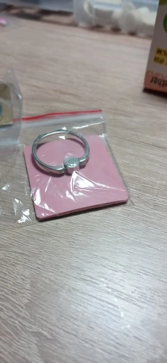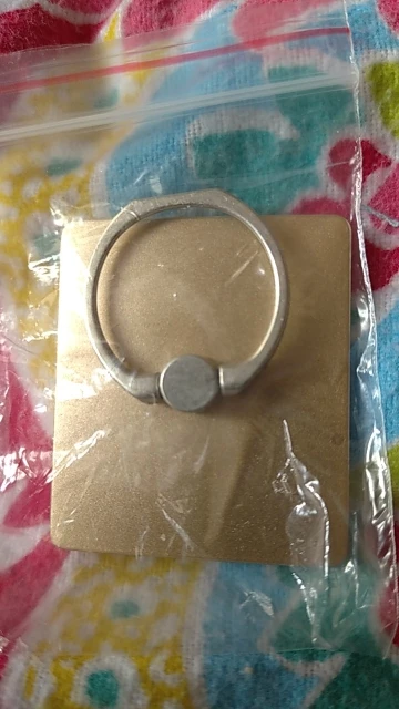 Кольцо из очень тонкого металла. Очень маленький пластмассовый держатель. Очень тугое, еле поворачивается. Выглядит не как на фото, там оно массивней. В моем случае оно ещё и косое, а также с царапинами на пластмассе.