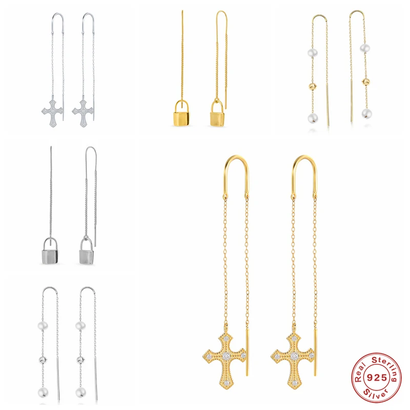 925 пробы, серебряные жемчужные бусины, серьги-подвески с длинной цепочкой, висячие серьги-подвески с крестиком