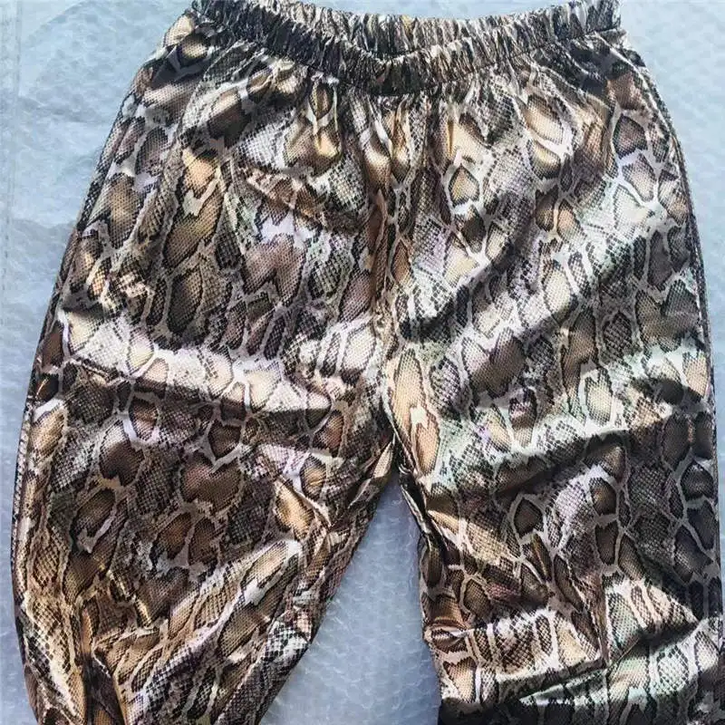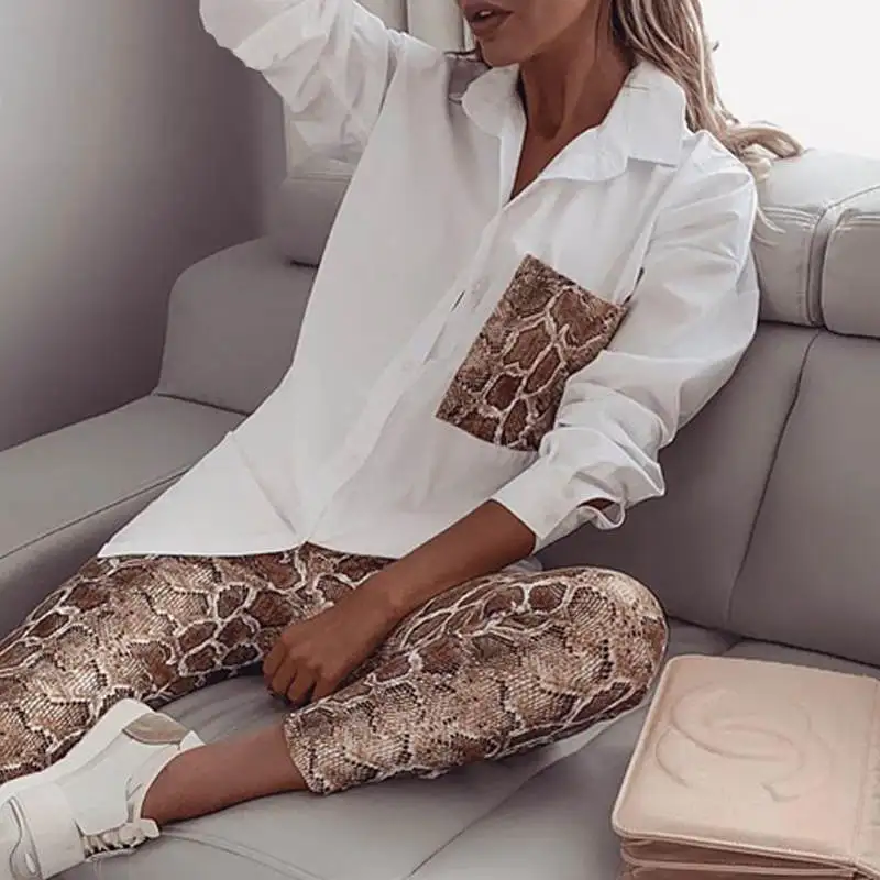 Комплект из двух предметов, женская рубашка с принтом змеиной кожи, блузка с длинным рукавом и карманами, женские брюки, комплекты из тонкого искусственного пластика