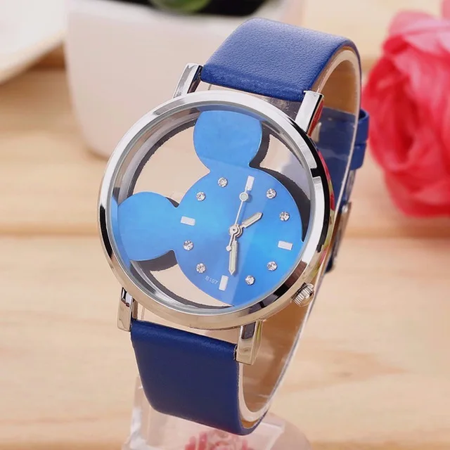 Роскошные Брендовые женские часы с Микки Маусом, Модные прозрачные женские часы с кожаным ремешком и полым циферблатом, часы для мальчиков и девочек, популярный подарок, zegarki meskie