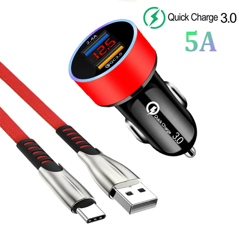 Автомобильное зарядное устройство QC 3,0 с двумя USB-портами и кабе...