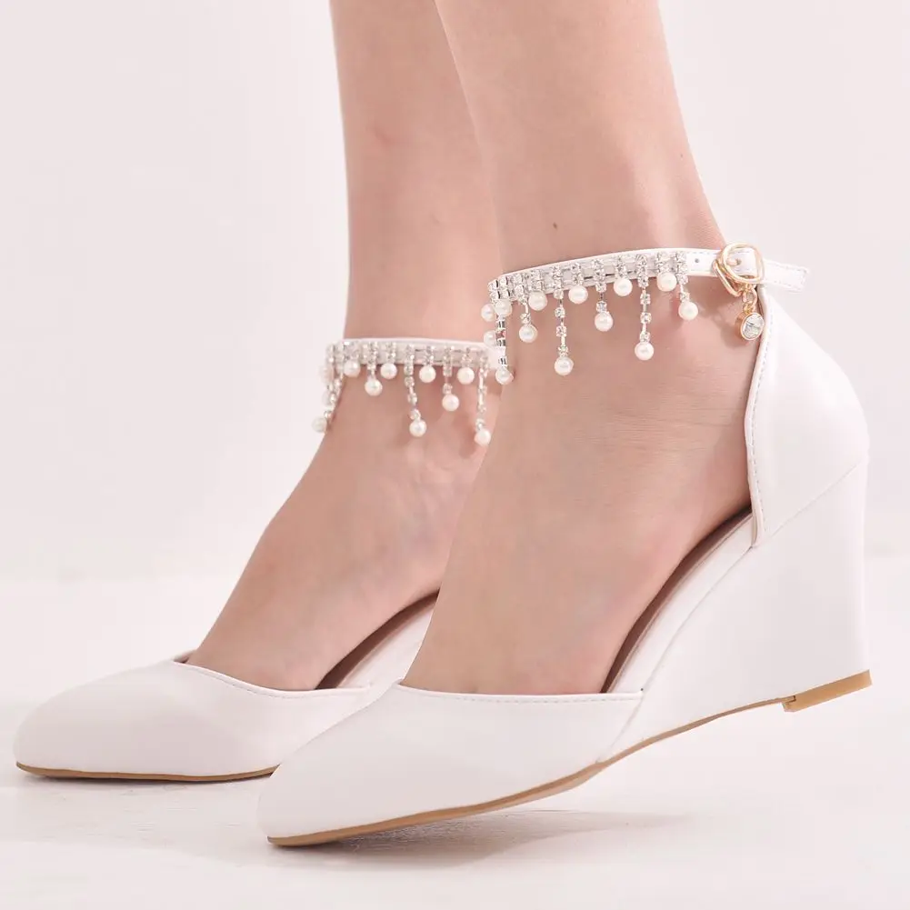 Женские босоножки с острым носком, туфли на высокой танкетке с пряжкой и бисером, весна-лето 2021