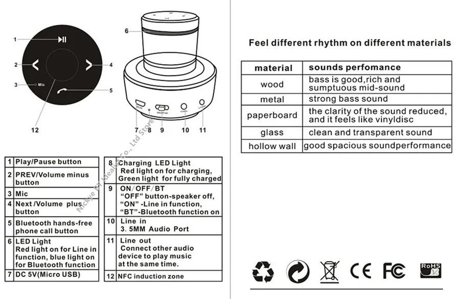 Различные материалы дают различный звуковой эффектПочувствуйте разный ритм на разных материалахДерево: бас хороший, богатый и роскошный Средний звукМеталл: сильный звук басовКартон: четкость звука уменьшается, и он кажется винилдискомСтекло: чистый и прозрачный звукПолые стены: хорошая вместительная звуковая производительностьОбратите внимание: