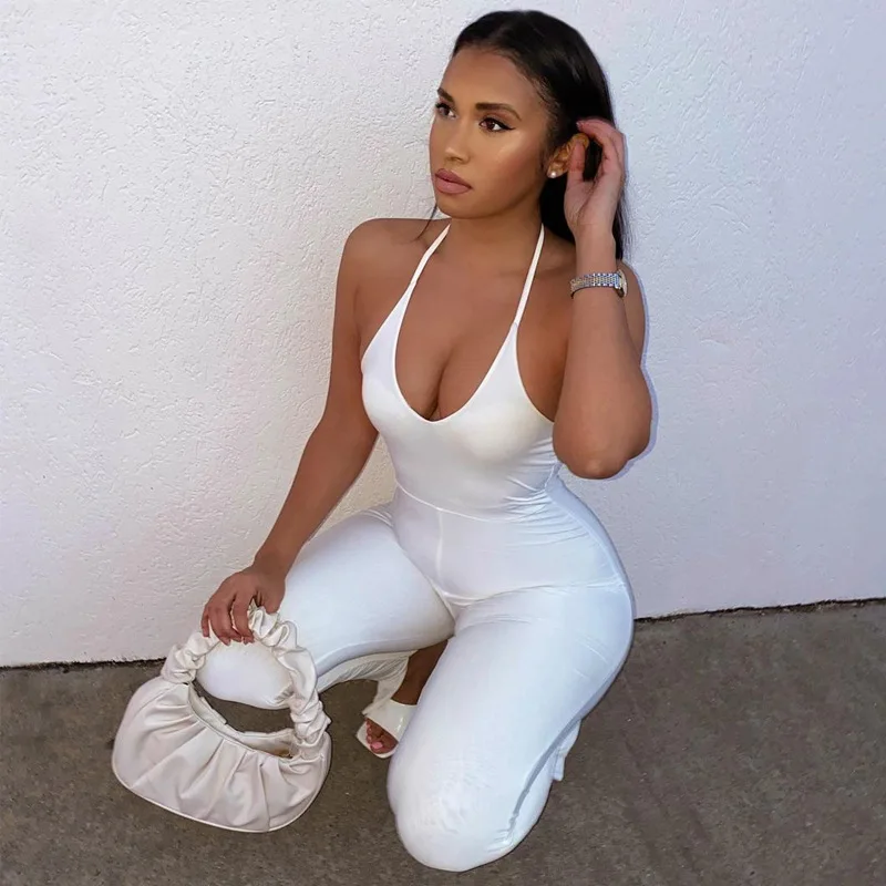 Новинка 2021, брюки, женский сексуальный комбинезон с лямкой на шее, однотонный комбинезон для взрослых без рукавов, с открытой спиной и V-образным вырезом, комбинезон с разрезом и завязкой