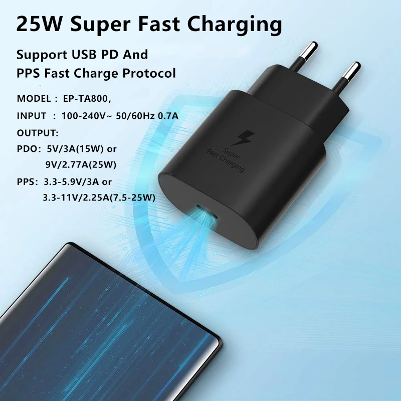 -Супер быстрая зарядка Samsung EU 25W -- Модель: EP-TA800 -- Выход:(PDO) 5,0 V-3.0A (15W) или 9,0 V-2.77A (25W) (PPS) 3,3-5,9 в/3.0A или 3,3-11,0/2.25A (7,5-25 Вт) -- Кабель Type-C-Type-C 1 м поддерживает 3 А Зарядка и передача данных