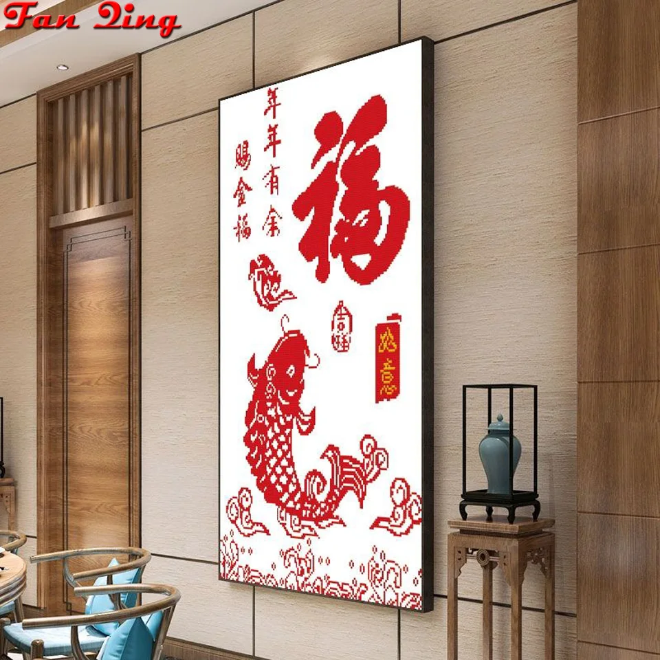 Алмазная вышивка, мозаика, картина с рыбками, вышивка крестиком, полное круглое сверло, благословение, удача, карпы, китайский иероглиф, сделай сам, 5D декор, Gif