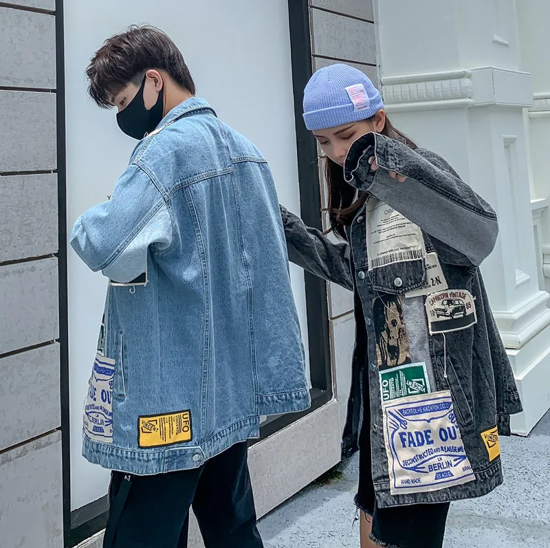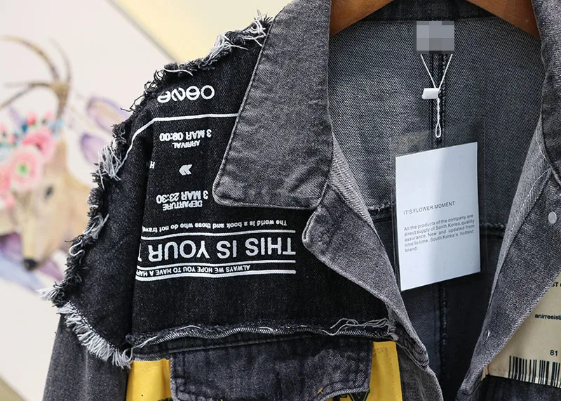 Джинсовая куртка с аппликацией, черная уличная одежда с длинным рук...