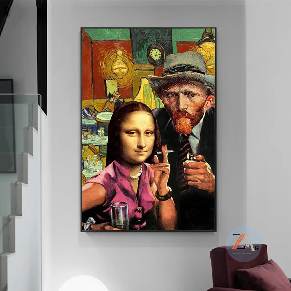 Столкновение произведений двух известных художников искусство Мона Лиза и Ван Гога курительная Картина на холсте настенный художественный плакат и гостиная