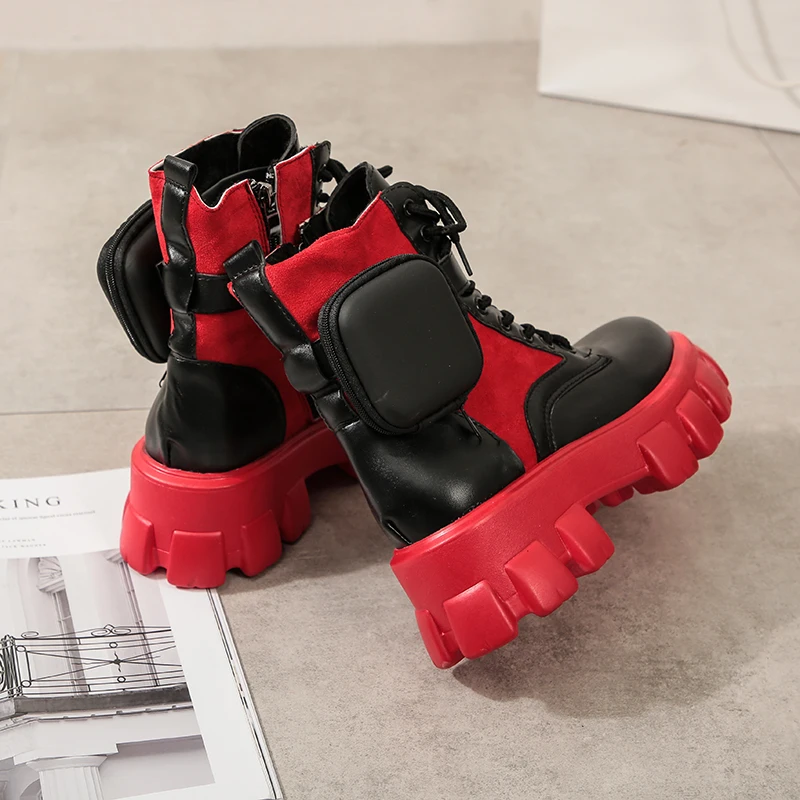 Сапоги женские кожаные, черные, с карманами, на платформе, красные, 2021