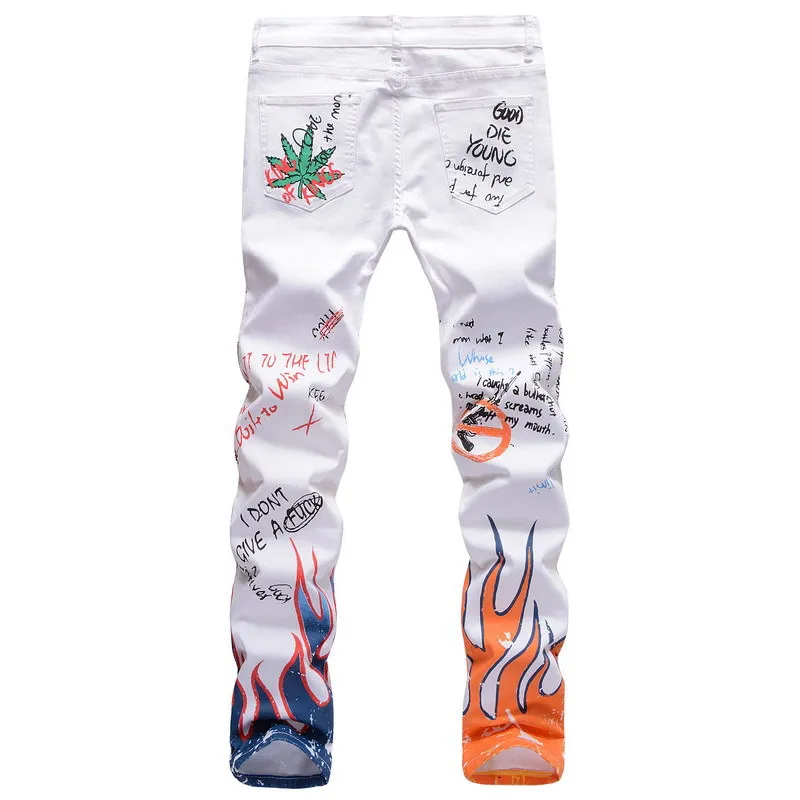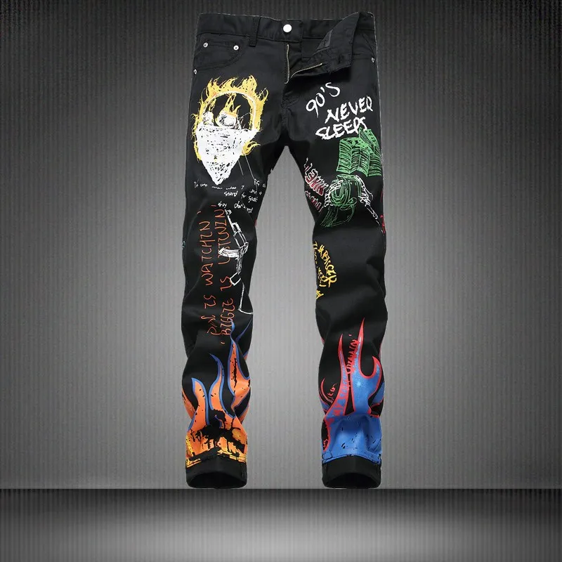 Новинка 2021, модные мужские джинсы с принтом пламени, зауженные пр...