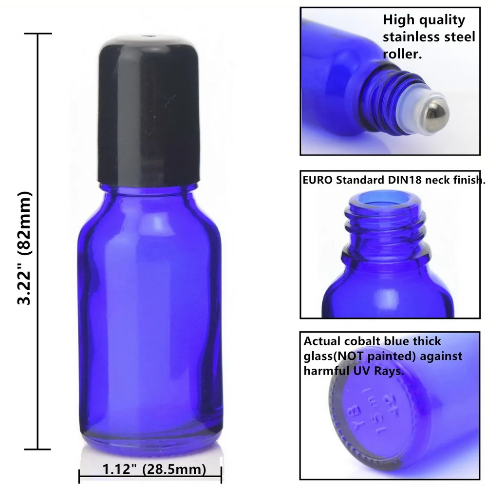 Особенности продукта:12 штук кобальтовое стекло роликовые бутылки с гладкими роликами из нержавеющей стали и черными колпачками.