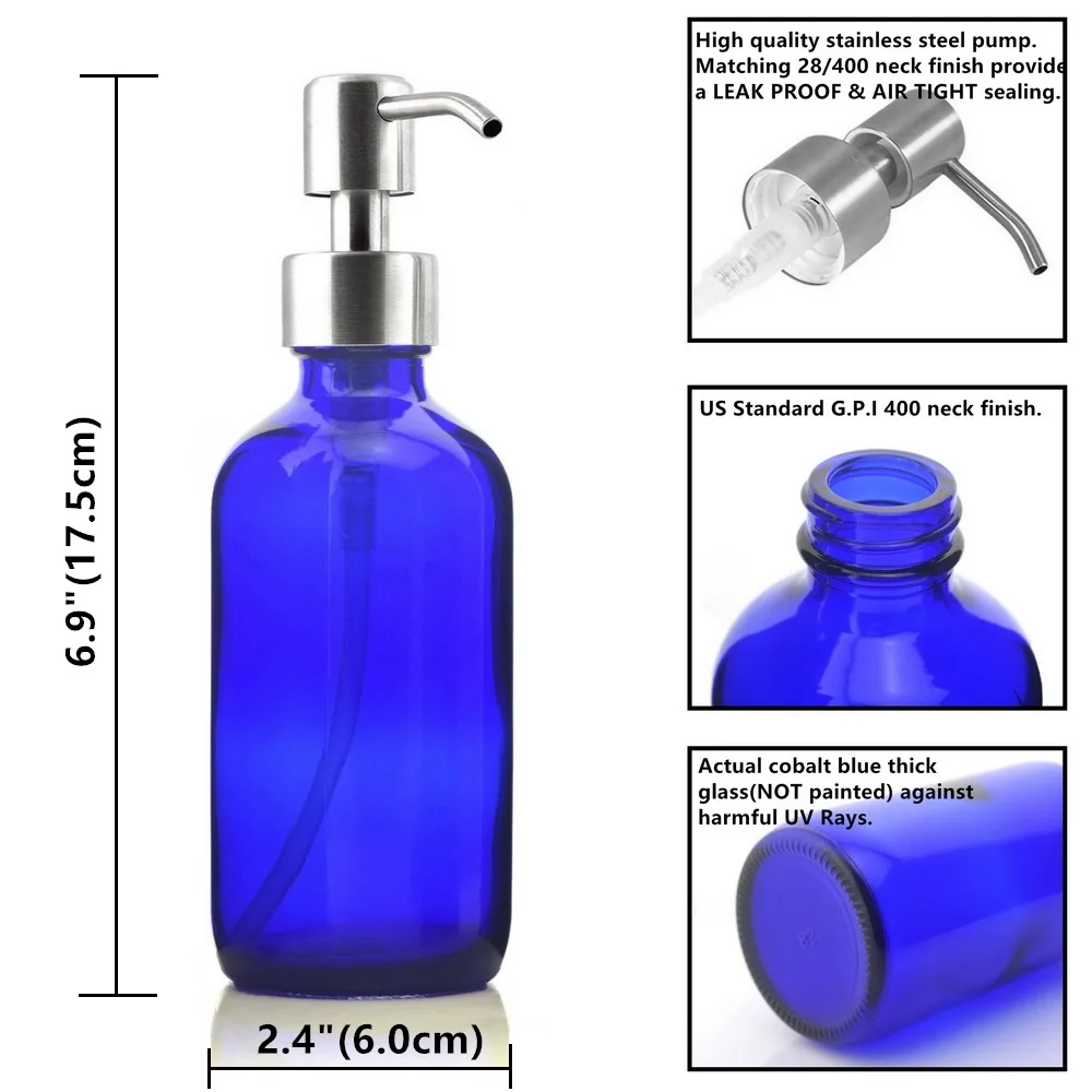 Особенности продукта:Супер набор из 4 прочных, многоразовых, 8 унций кобальтовых голубых стеклянных бутылок с ручными насосами из нержавеющей стали, красиво украсит любой дом, добавив визуальное притяжение на кухню, ванную столешницу или душ. Голубые кобальтовые бутылки отлично смотрятся везде, где они используются.