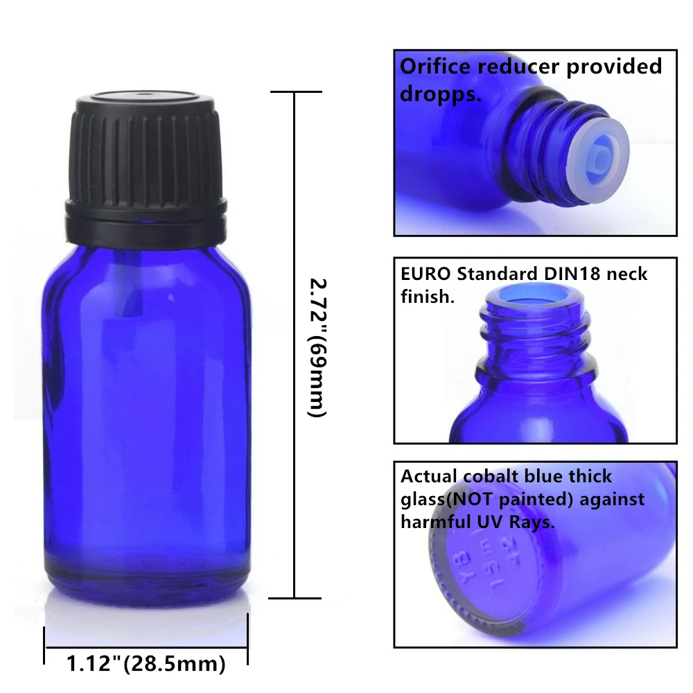 Флаконы для эфирных масел, 24 шт., 15 мл, из кобальтового синего стекла, с отверстием, с редуктором, с евро капельным дозатором защитой от вскрытия, для ароматерапии, духов