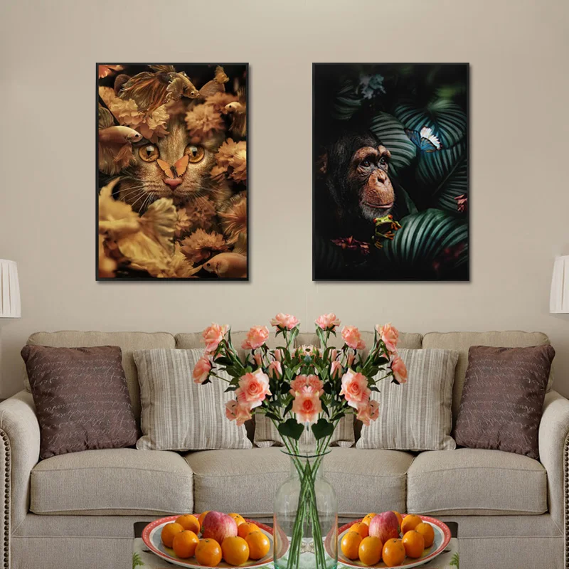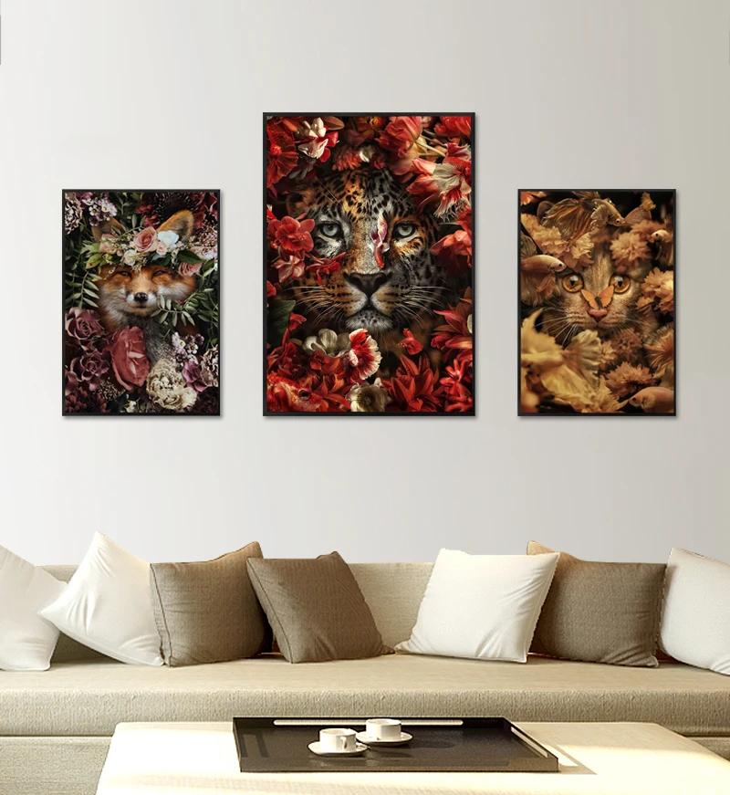 Картина с изображением животных в цветах, плакат со львом, тигр, леопард, лиса, орангутан, Картина на холсте, Современная классическая гостиная