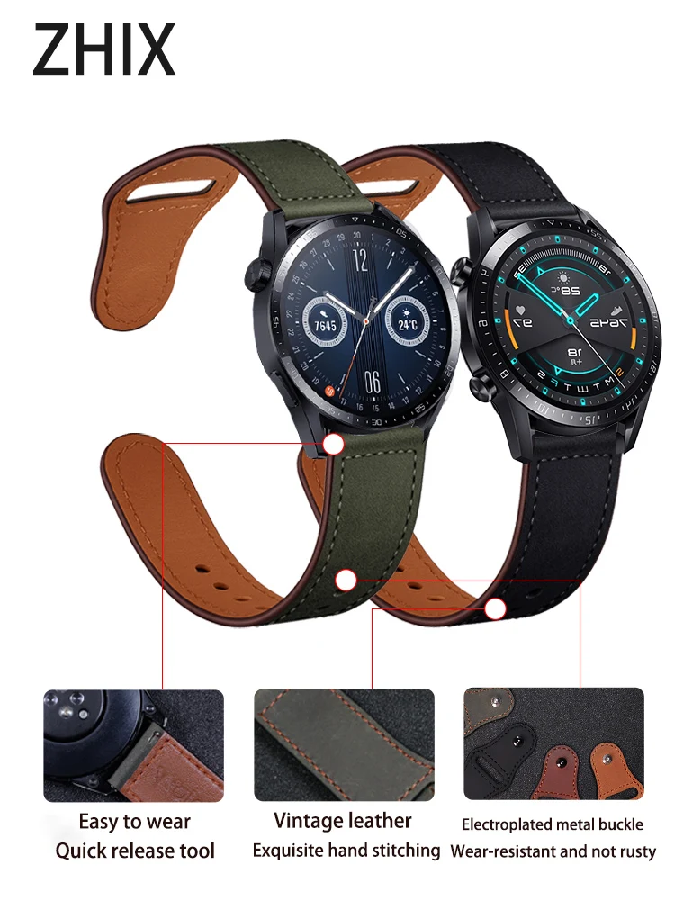 Ремешок ZHIX кожаный для мужских и женских часов, металлический браслет с обратной пряжкой 22 мм для huawei watch gt2 gt3 watch 3 wathc3pro
