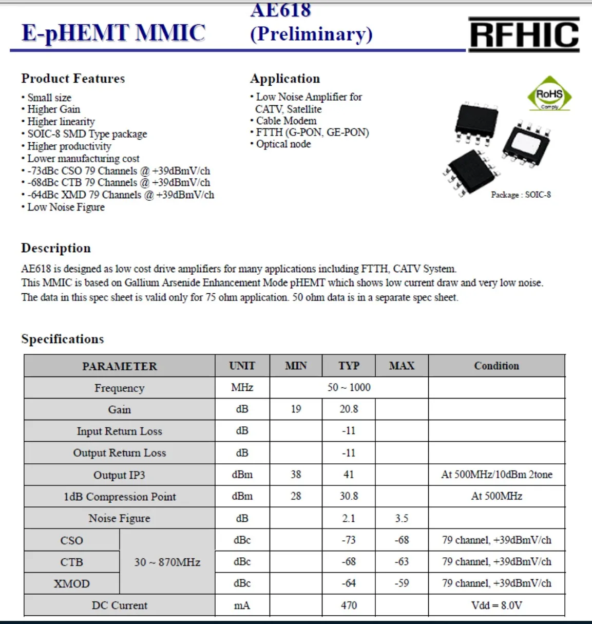 Линейный усилитель 1 Вт AE618 50 МГц-1000 МГц 20 дБ для малошумной ...