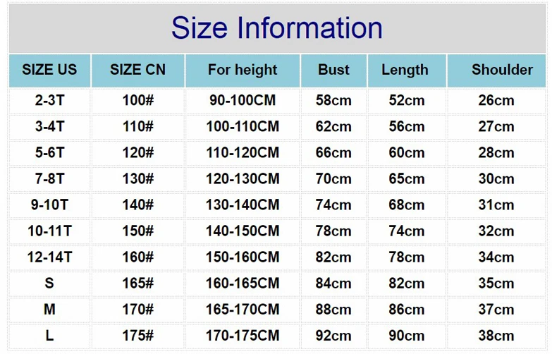 1. Если ваш ребенок полненький, мы рекомендуем выбрать больший размер. Пожалуйста, обращайтесь к своим детямФактическийВысота и Таблица размеровДо покупки/торгов. Спасибо.
