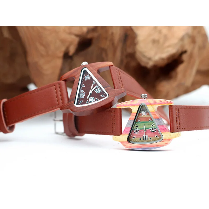 Женские часы из бамбукового дерева, черные красные сандалии, деревянные треугольные наручные часы, креативный женский браслет, кожаный ремешок для часов, женские часы