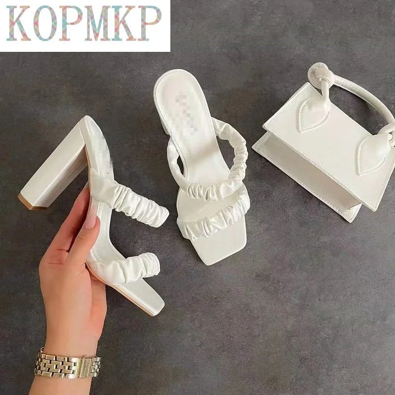 Мюли женские на квадратном каблуке, сандалии цвета хаки, шлепанцы, квадратный носок, сланцы, высокий каблук, пикантная летняя обувь, белые черные, 021