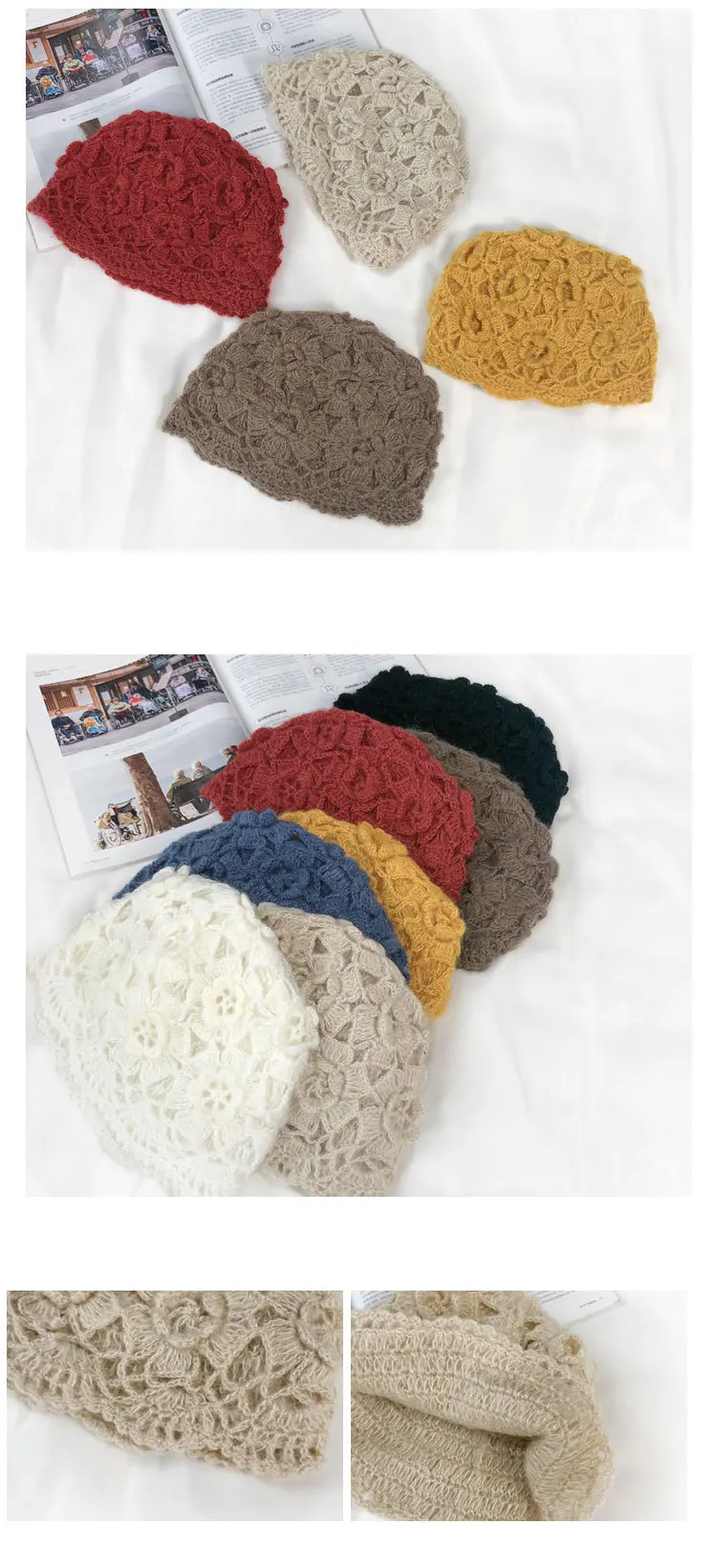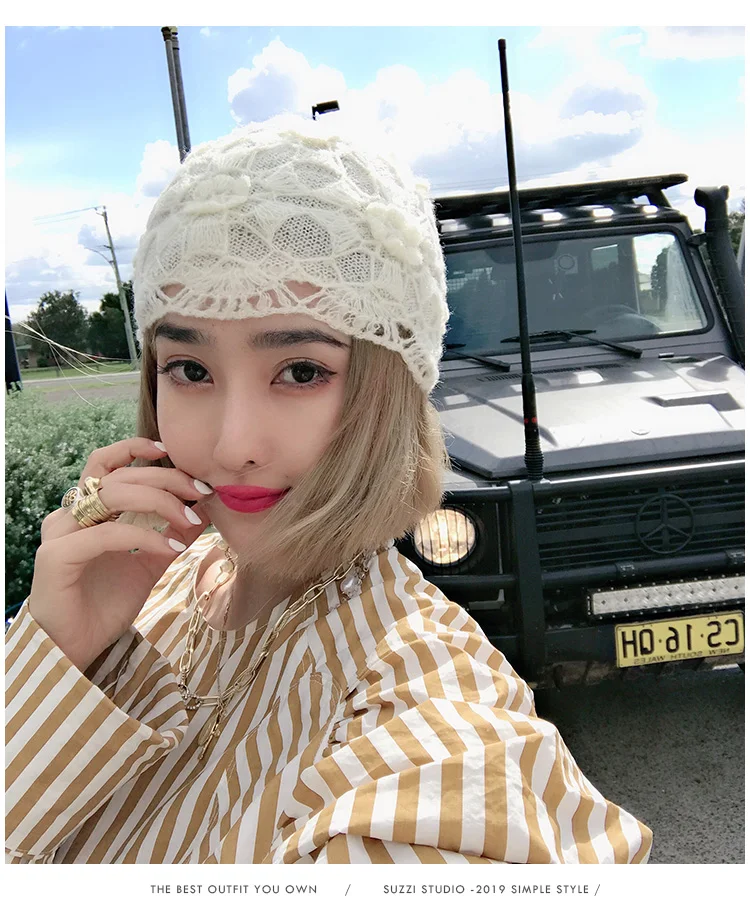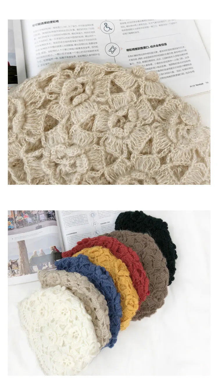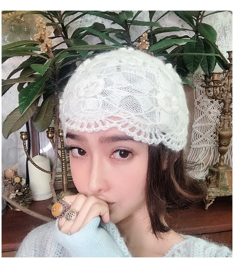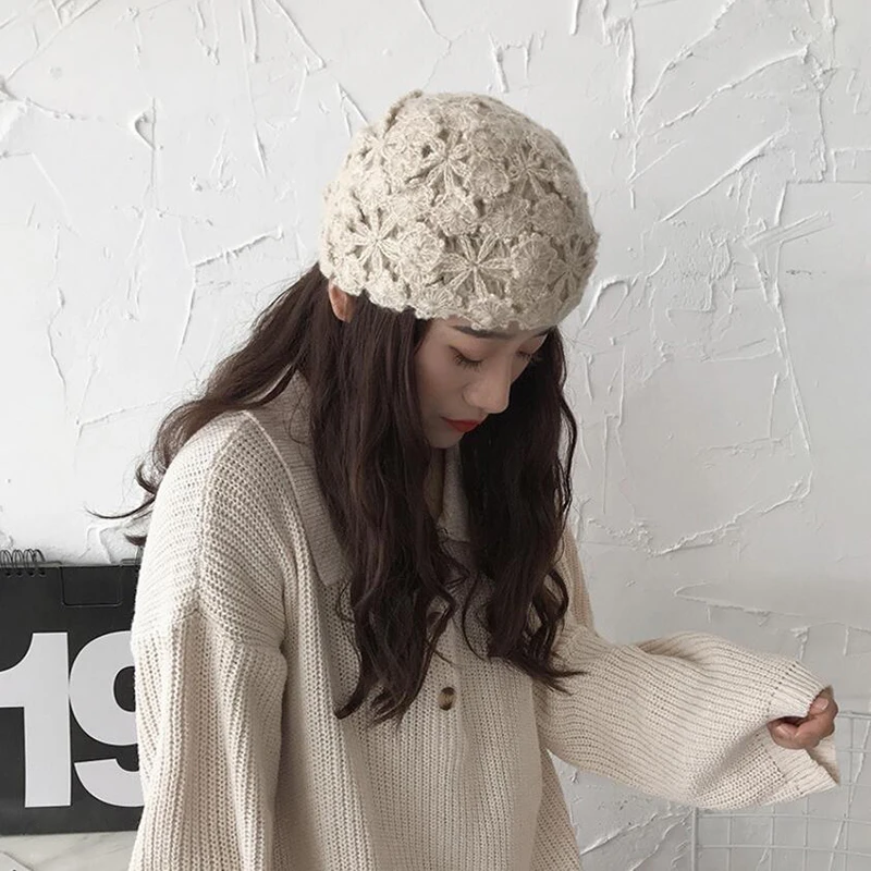Новинка 2021, симпатичные зимние вязаные крючком шапки для женщин, облегающие шапки, вязаная шапка ручной работы с цветами, Женская кружевная шапка, женские шапки