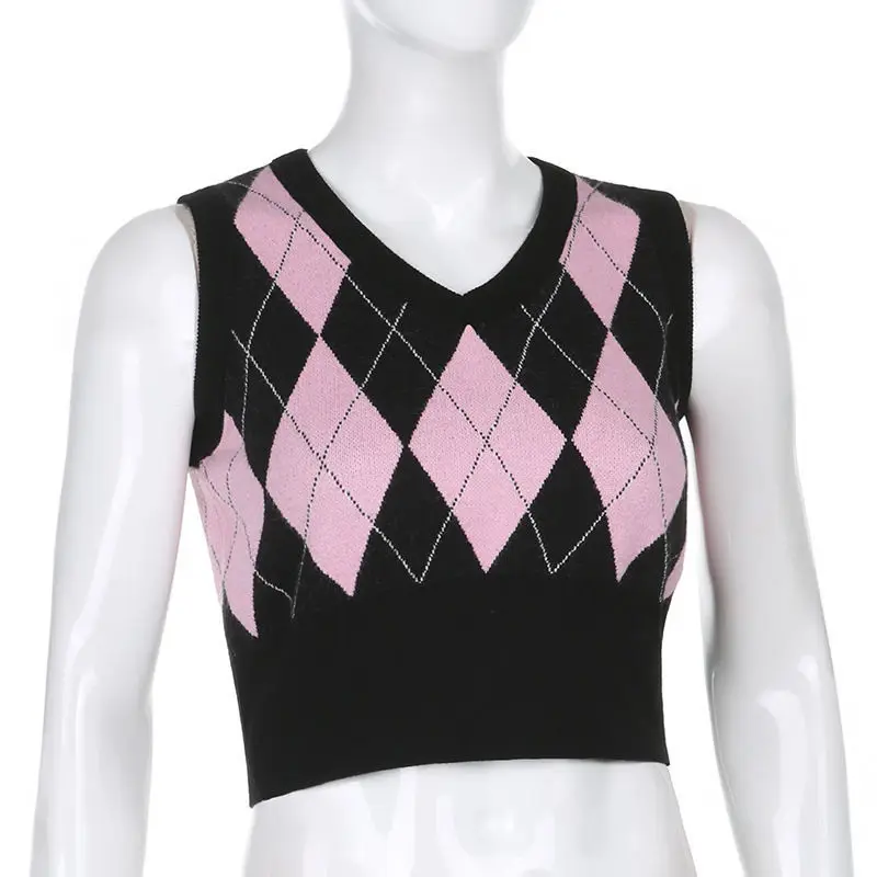 Женский свитер, жилет с ромбами контрастных цветов, короткий облегающий жилет без рукавов, Женский пуловер, свитер с V-образным вырезом, жилет