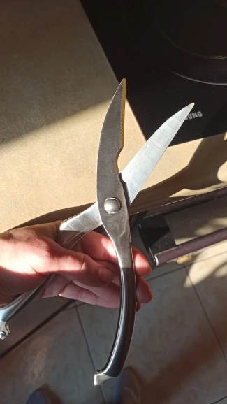 Ножницы великолепные. Мощные, тяжёлые, при этом не слишком длинные лезвия, но длинные рукоятки, то есть большое плечо, приходится применять совсем немного силы. Плотное смыкание, очень удобные в руке, берут даже куриные кости. Украсят любую кухню! Доставка через Пятёрочку 11 дней.