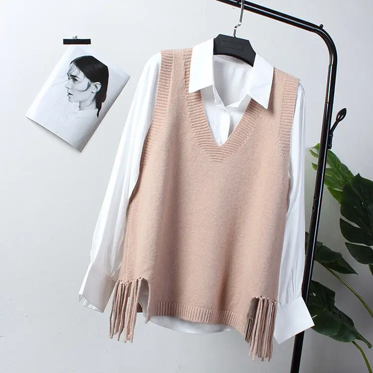 Женский жилет, весенний Короткий трикотажный жилет с кисточками и V...