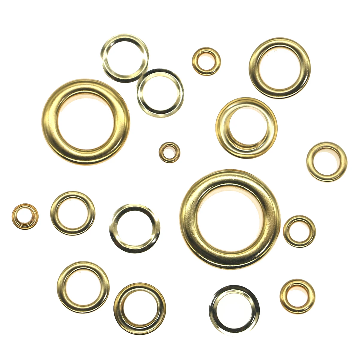 СпецификацияРазмер: 3,3.5,4, 4,5, 5,6,8,10,12,14,17,18,20,25,30 мм (диаметр фланца)Сочетание: (люверсы и шайбы)Доступные цвета: золотистый