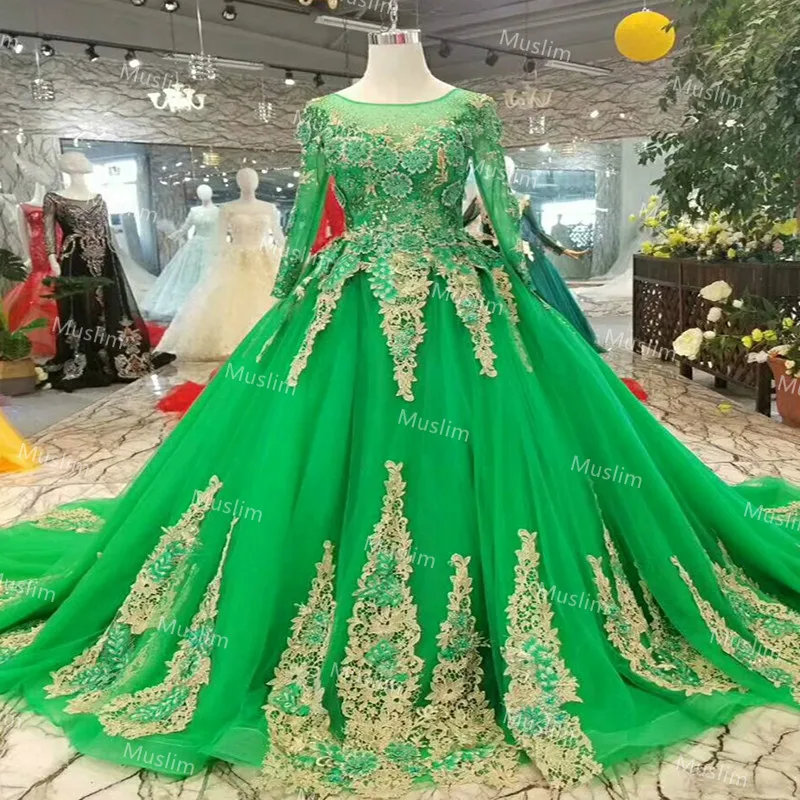 Свадебное платье принцессы, зеленое мусульманское платье трапециевидной формы, с аппликациями, длинными рукавами, на шнуровке, для свадьбы, для свадьбы, во французском стиле