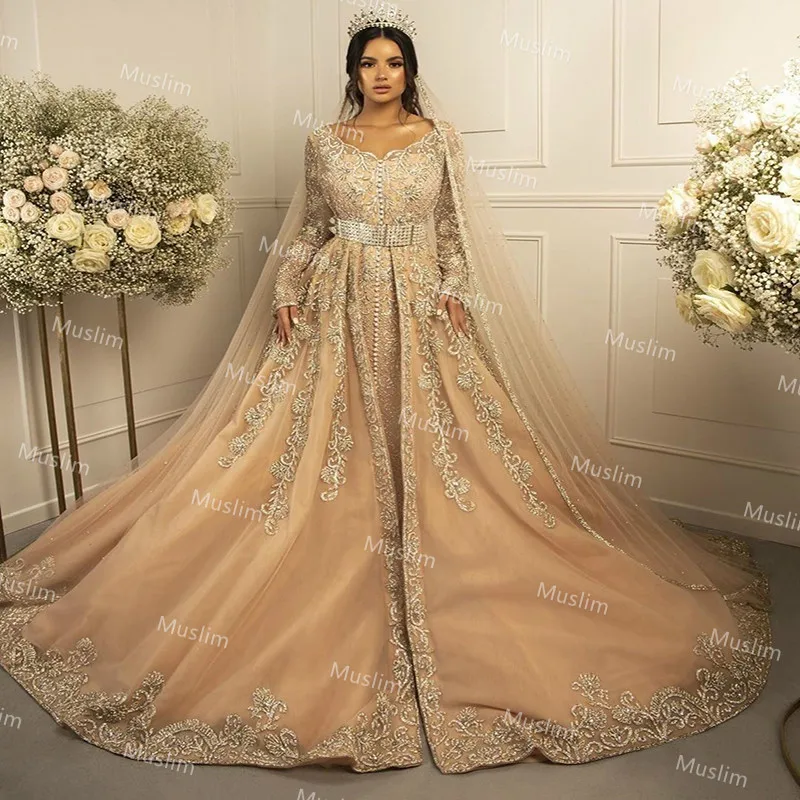 Роскошный Золотой кафтан, свадебные платья в морском стиле с аппликацией, винтажные мусульманские Арабские Свадебные платья с длинным рукавом, 2021, принцесса, невеста