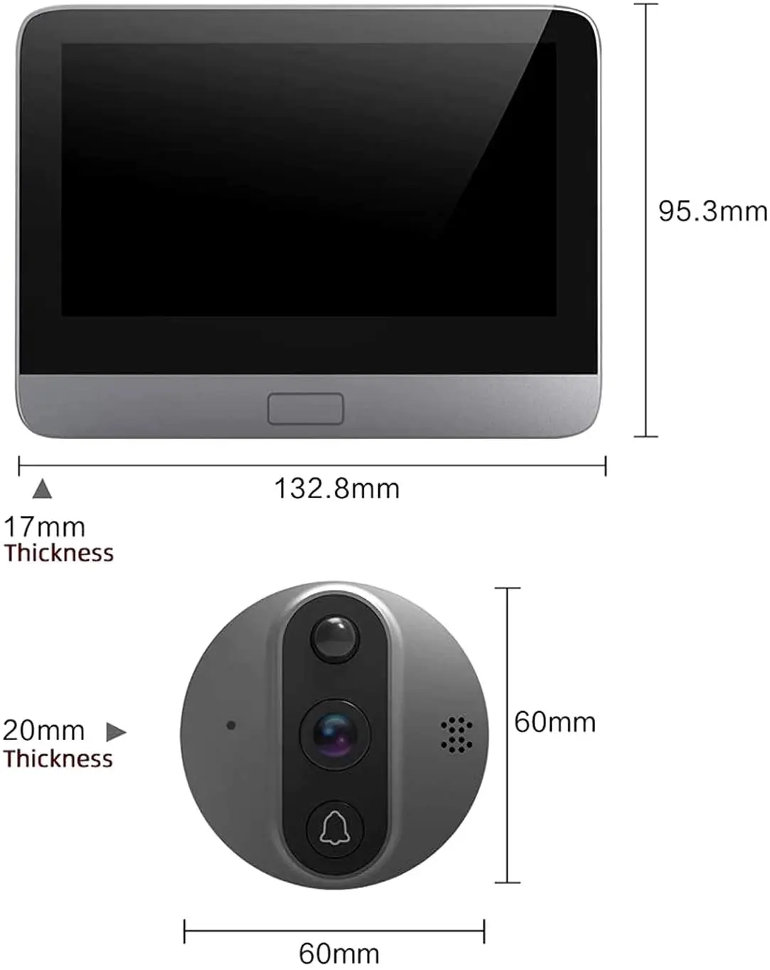 Диапазон толщины двери: 35-115 мм (Пожалуйста, измерьте толщину двери перед покупкой) Характеристики: ★Диагональ экрана: 4,3 дюймовУгол обзора: 120 градусов ★Разрешение ЖК-экрана 480*272 ★Источник питания: литий-ионный аккумулятор 5000 мАч (встроенный), нормальное использование (3-5 раз в день) около 30 дней в режиме ожидания. ★Напоминание о батарее: подсказки приложения в реальном времени. Когда батарея меньше 5%, устройство сообщает о низком энергопотреблении. Приложение с низким энергопотреблением не может подключаться к устройству ★Напоминание о батарее: подсказки приложения в реальном времени. Когда батарея меньше 5%, устройство сообщает о низком энергопотреблении. Приложение с низким энергопотреблением не может подключаться к устройству ★Формат видео: H.264 ★Формат видео: H.264 ★Дисплей: 5,0 дюймов/4,3 дюймов TFT цветной ЖК-дисплей экран ★Карта памяти: до 64 ГБ ★Толщина двери: 35 мм-130 мм (Пожалуйста, измерьте толщину двери перед покупкой) ★Диаметр отверстия двери: 15 мм-60 мм Примечание: Возможны отклонения в 1-3 см вследствие измерений вручную.