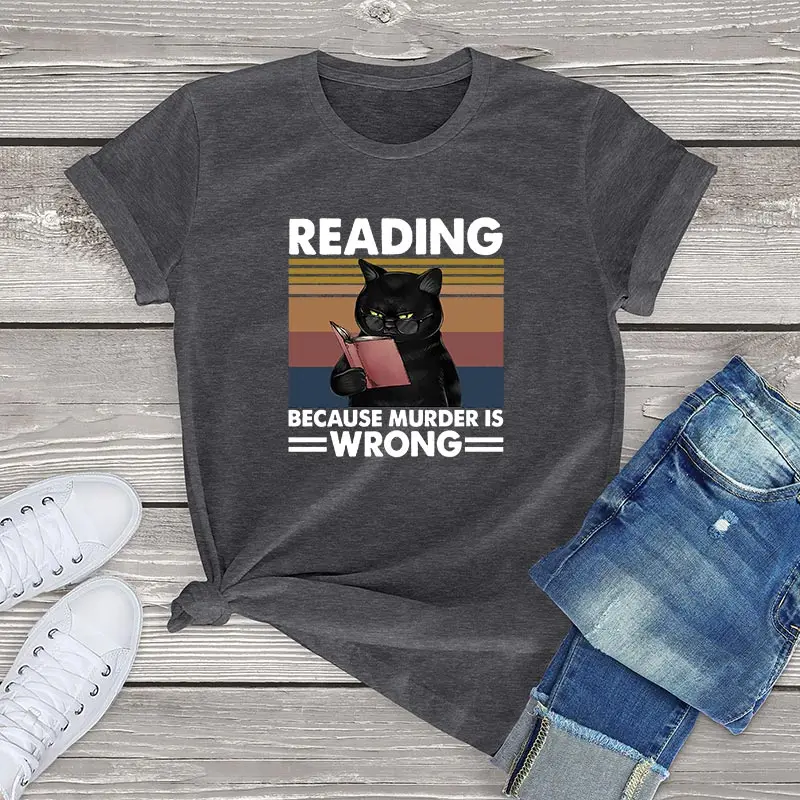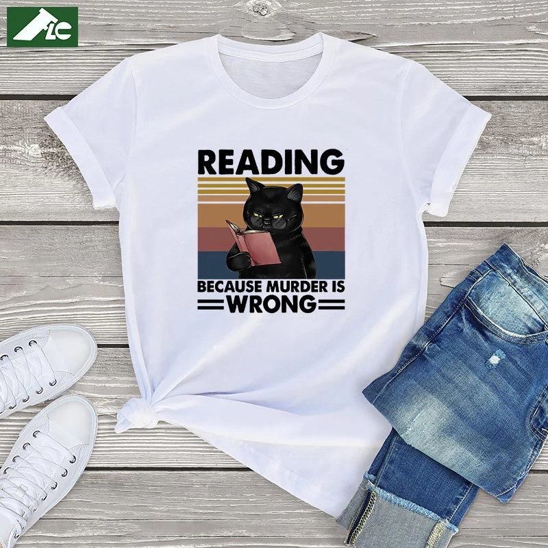 Забавная футболка унисекс с надписью «Black Cat Reading потому, что убийца не тот», женская блузка kwaii, 2021, черная футболка с рисунком кота, женская модная одежда для девочек, хлопковый топ на лето 2021