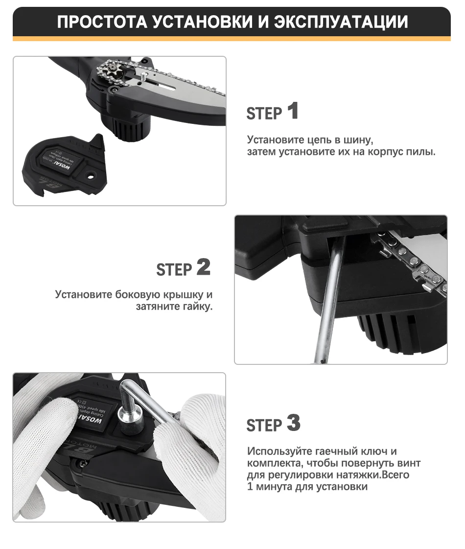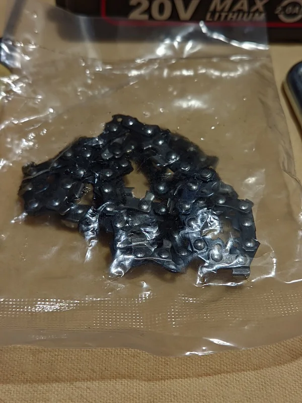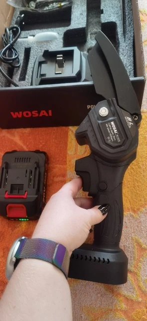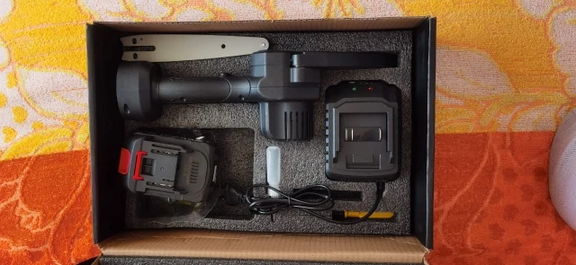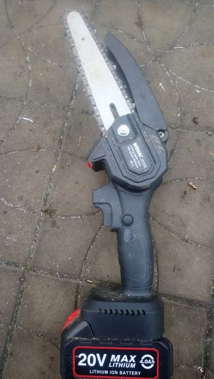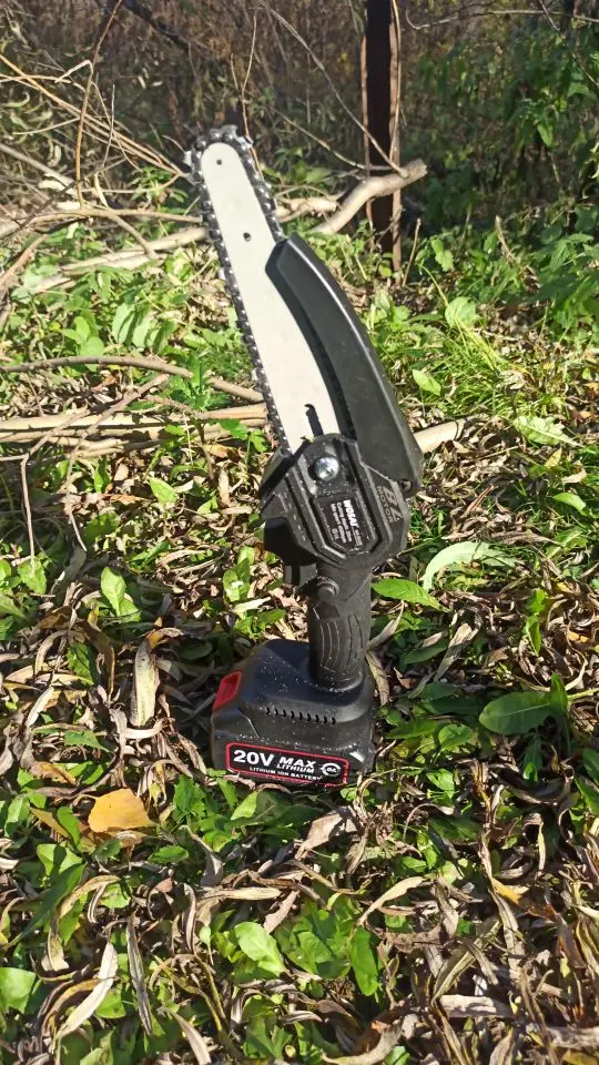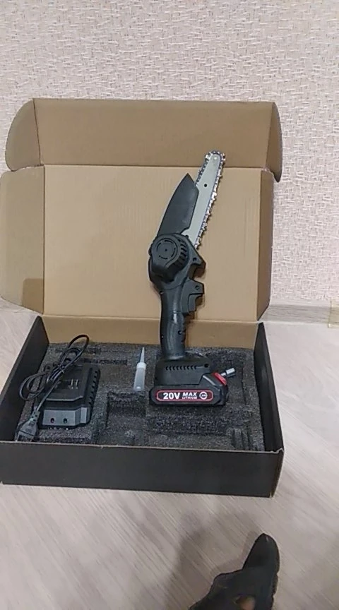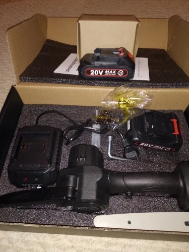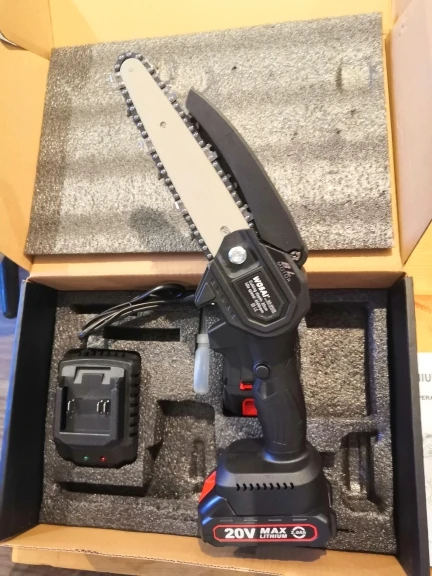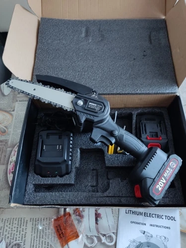 Для сучьков деревьев отличная вещь,работать удобно,так как держать можно одной рукой,а второй -ветку, после получения смазал, и поставил барашек-фиксатор. Так как натяжка шины постоянно ослабляется,приходится часто дожимать, это ГЛАВНЫЙ минус,так же периодически нужно смазывать цепь,Я капал отработку( не бьёт по карману). Комплектная шина оказалась бракованной,не крутилась зубчатая шайба на конце,после обращения к продавцу (с отправлением видео о заклинившей шестирёнки) он прислал другую шину,фото 2(она на ступень выше качеством, всё работает).Для этой пилы сделал коробку, для неё подходят аккумуляторы от Шурика и болгарки восай(аккумулятор заканчивается на 10 с-более мощный заверил продавец). Продавец адекватный,брак исправляет после доказательства. Надеюсь не зря писал.