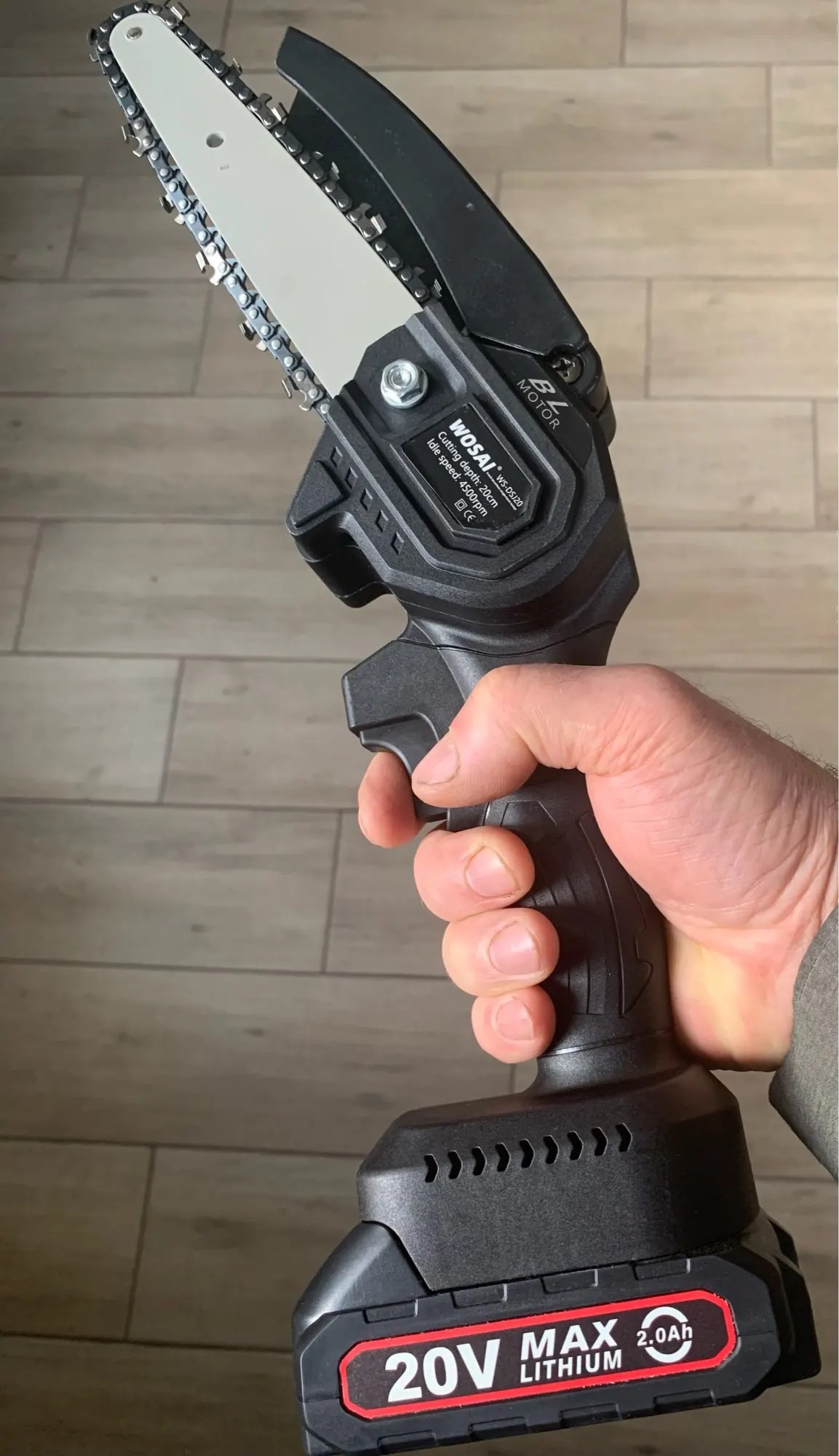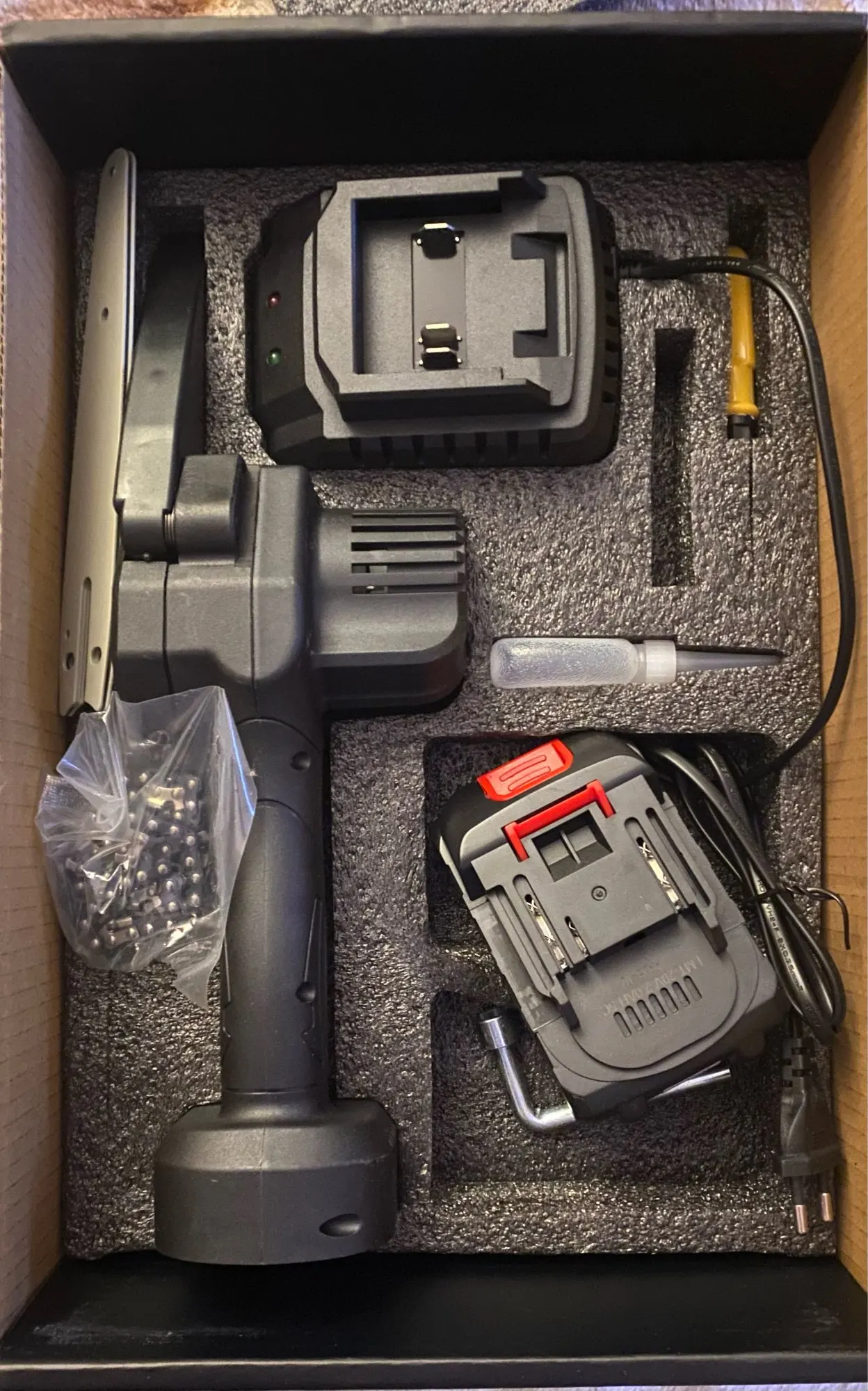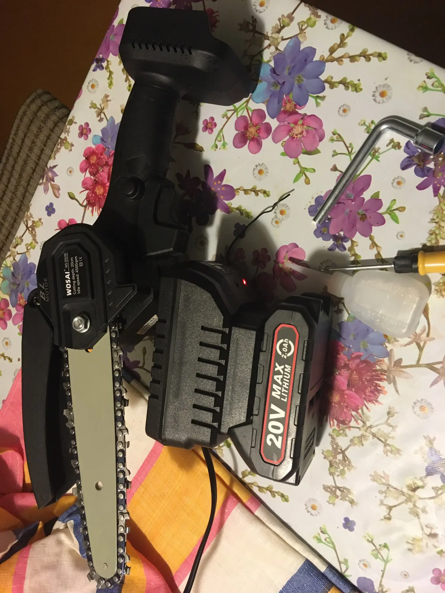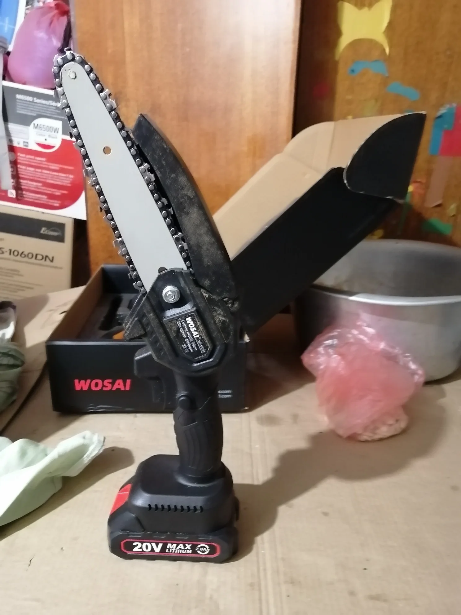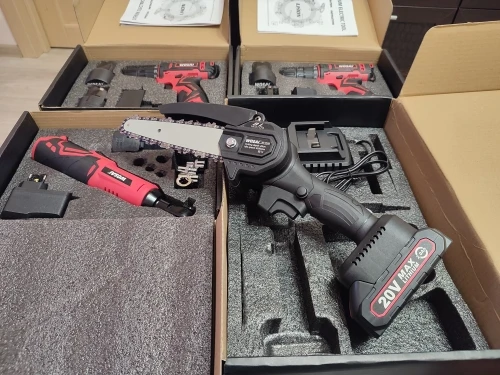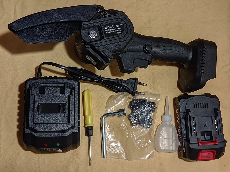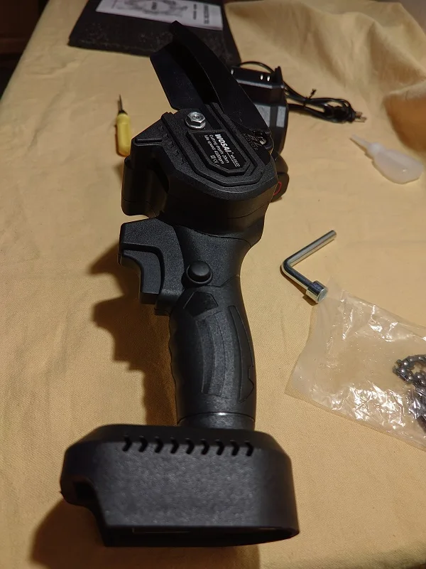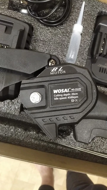 Это вторая покупка этой компании Wosai. Первой покупкой был шуруповёрт ( тоже 20v) отличное качество, поэтому и заказал цепную пилу с таким же аккумулятором (20v) отцу в подарок,опиливать ветки в саду) И летом поехав в гости повзаимствовать на пикник, чтобы дрова для костра пилить!;) Качество пилы хорошее , с ней идее сосуд под масло наверное) пустой правда,но это ничего страшного. Выкладываю фото)))
