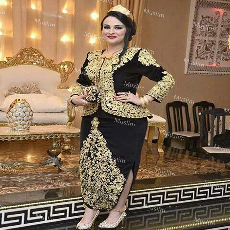 Сексуальные черные вечерние платья с золотистой аппликацией, платье до щиколотки с Боковым Разрезом, Арабский кафтан, платье для выпускного вечера, вечерняя одежда