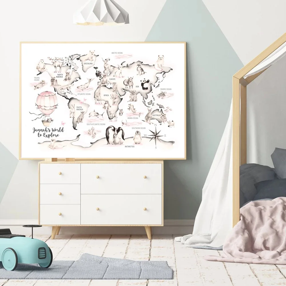 Настенный постер для детской комнаты, печать животных, карта мира, ...