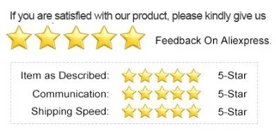 1. Если вам нравится товар, который вы получили, пожалуйста, оставьте нам положительный отзывы с пятью звездами. Мы будем очень признательны, потому что это очень важно для нас. 2. Если вы не удовлетворены товаром или обслуживанием, пожалуйста, сначала свяжитесь с нами, мы постараемся Мы делаем все возможное, чтобы решить вашу проблему. Пожалуйста, не оставляйте отрицательный отзыв.