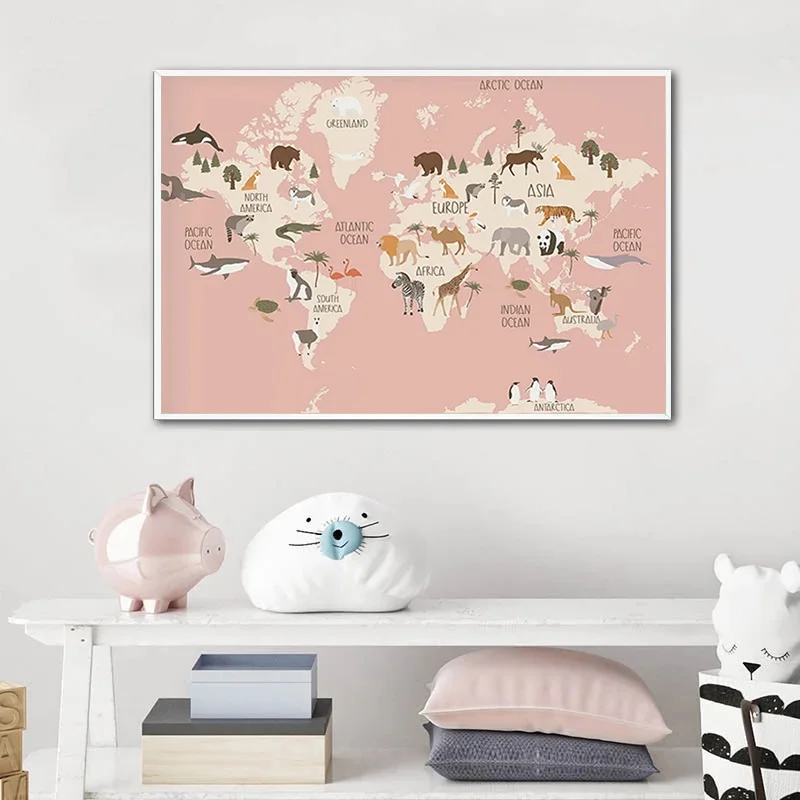 Образовательные животные Карта мира Картина Дети искусство стены хо...