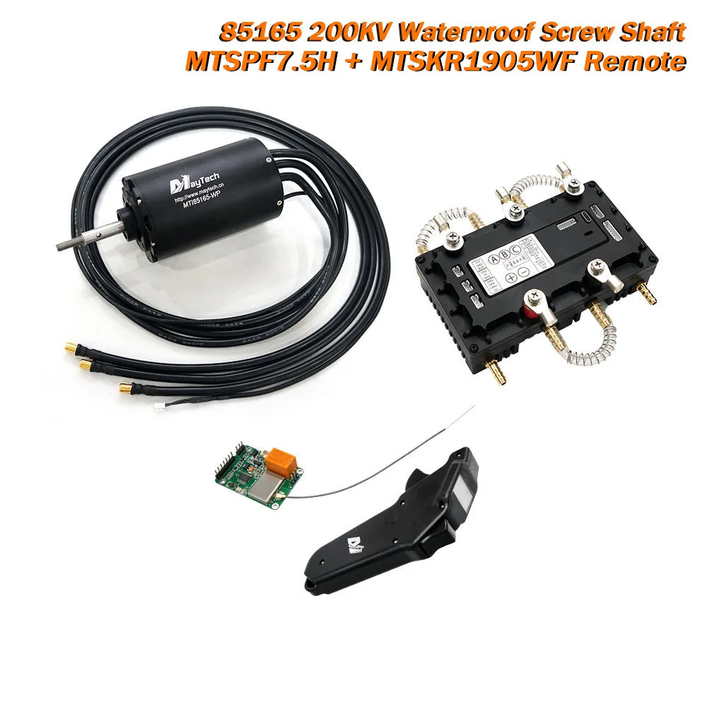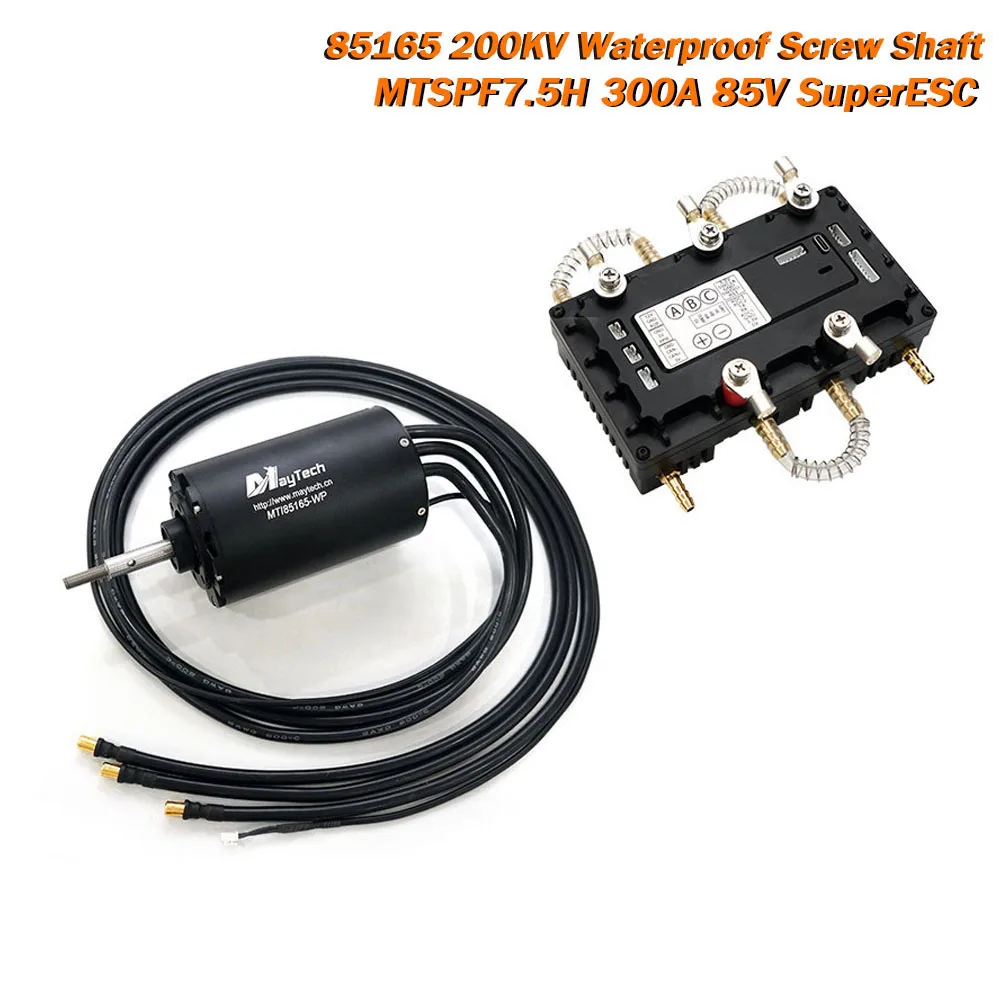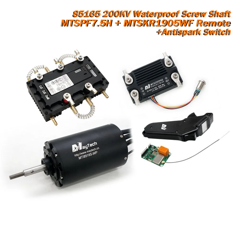 -MTI85165-200-SF Мотор: 200 кВ Бесконтактный водонепроницаемый мотор-MTSPF7.5H 300A 75V VESC SuperFOC ESC на основе VESC75_300 оборудования-Водонепроницаемый пульт дистанционного управления MTSKR1905WF IP67 с дисплеем, круиз-контролем, может отображать напряжение, выходной ток, температуру при работе с VESC-MTS2009AS 300A 85V antispark переключатель, может отрезать положительную мощность полюса, защита для контроллера скорости и батареи.