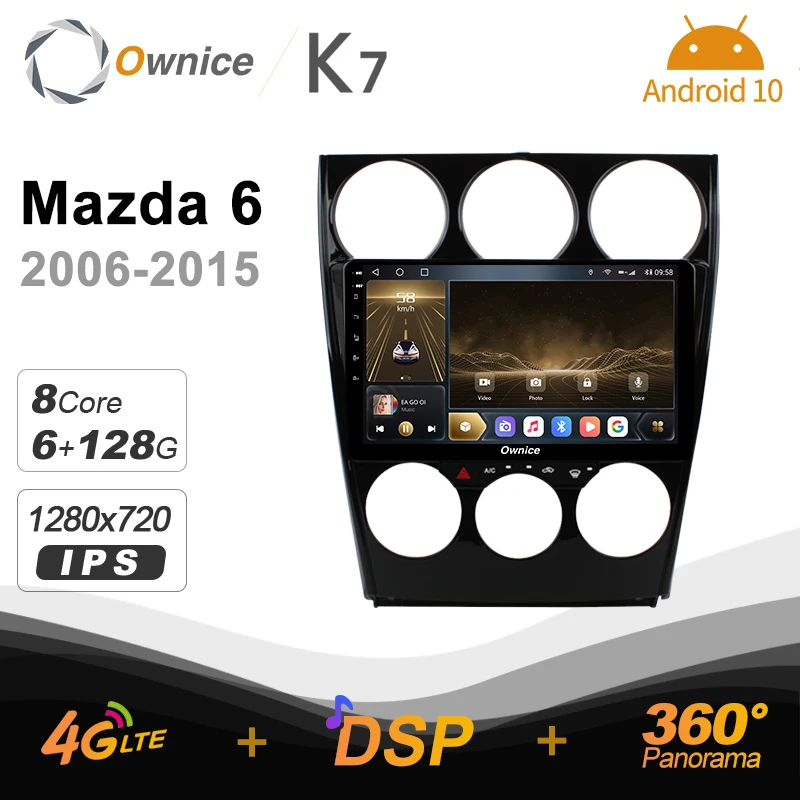 Автомагнитола Ownice K7, Автомобильная магнитола на Android 128, 6 ГБ + 10,0 ГБ, для Mazda 6 2006-2015, GPS, 2din, 4G LTE, 5G, Wi-Fi, Авторадио 360, SPDIF, 1280*720