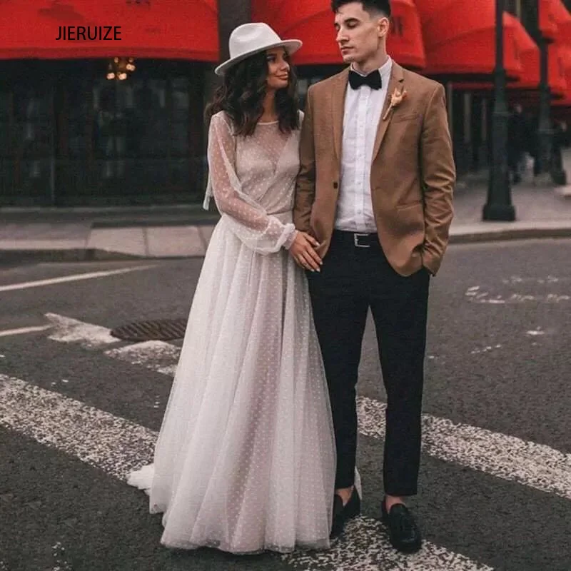 Белое Тюлевое платье JIERUIZE в горошек, летние свадебные платья с длинными рукавами и открытой спиной, пляжные свадебные платья, свадебное платье