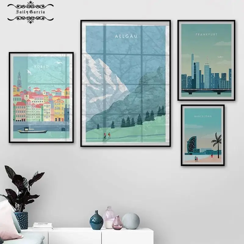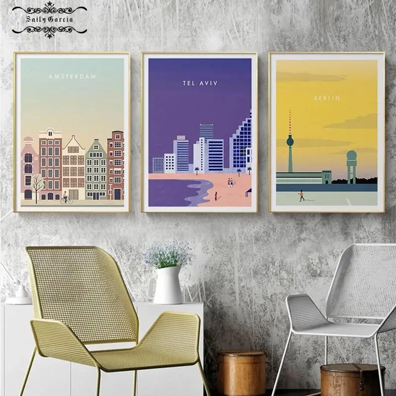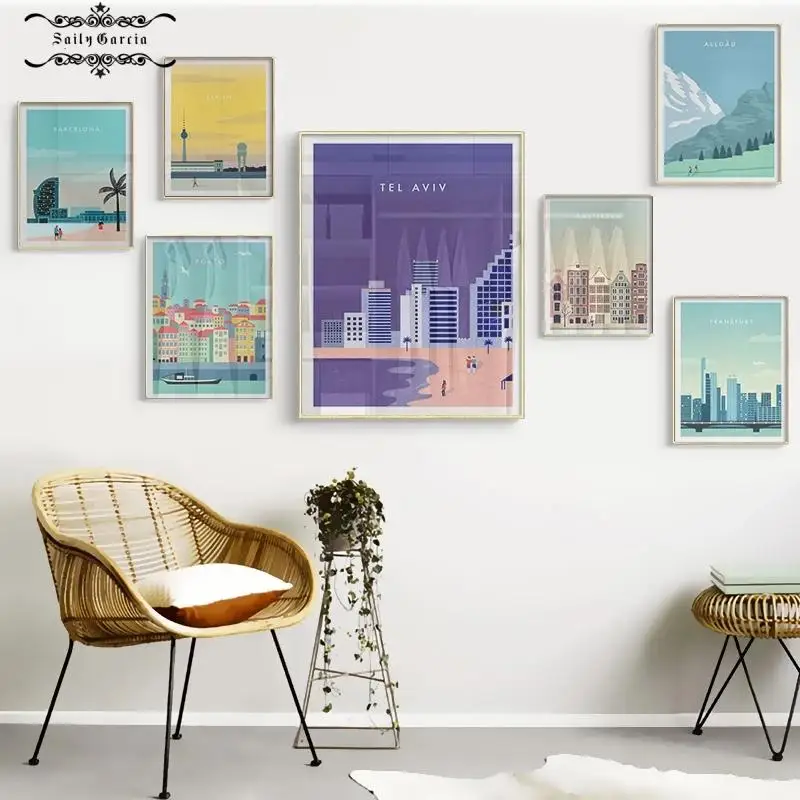 Современный минималистичный город Тель-Авив Allgau Франкфурт Берлин Порто Барселона плакат и печать мультфильм Настенная картина для домашнего декора