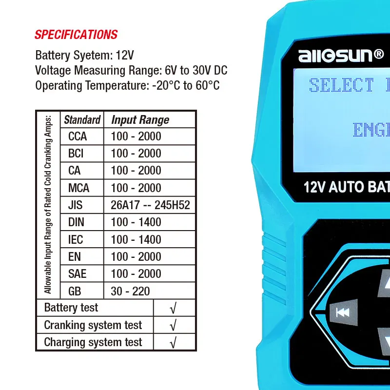 5. Стандарты тестирования включают большинство стандартов аккумуляторов по всему миру: CCA, BCI,CA, MCA, JIS, DIN, IEC, EN, SAE, GB.